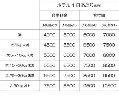 当院ではご利用料金の維持に努めてまいりましたが、昨今の諸経費の値上げや人件費の高騰を受け、やむを得ずペットホテルの価格の見直しを実施させていただくこととなりました。