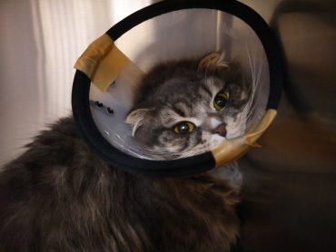 体調は問題なく、麻酔からもすぐに覚めて、今はお部屋の中で落ち着いて過ごしております。カラーが少し大きめなので抜けてしまわないように、安全の為ガムテープを貼りつけて補強しております。